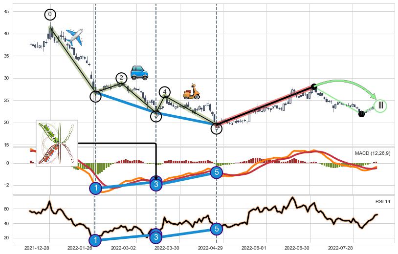 ➣ 第一, 三, 五浪下跌动能逐渐【衰弱变小】,趋势呈现不稳迹象