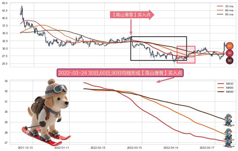 形态多维评估: ⚀ 2022-01-21日-2022-05-25日显现 30日-60日-90日均线 【高山滑雪】买入点 看多信号,后市看涨,买入