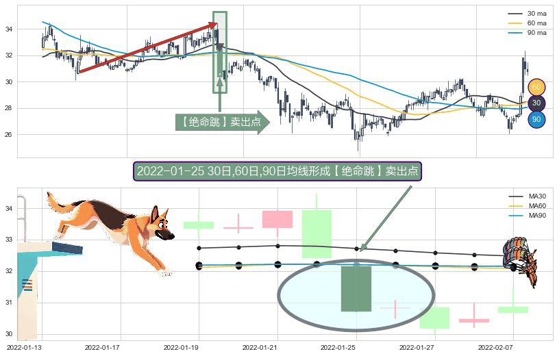 形态多维评估: ⚀ 2022-01-25日显现 30日-60日-90日均线 【绝命跳】卖出点 看空信号,后市看跌,卖出