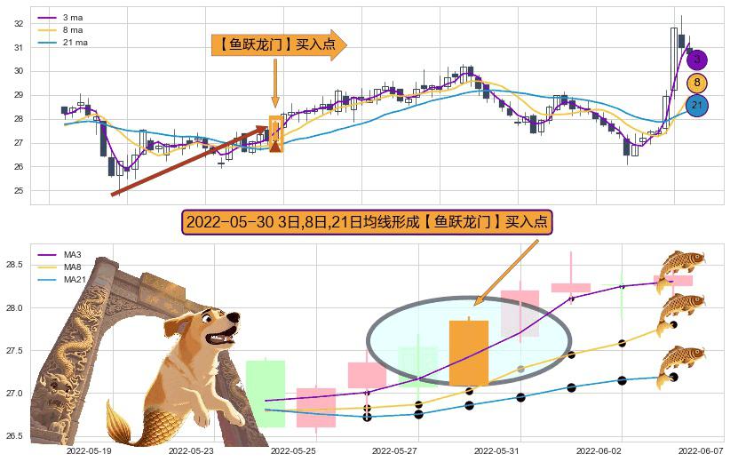 形态多维评估: ⚀ 2022-05-30日显现 3日-8日-21日均线 【鱼跃龙门】买入点 看多信号,后市看涨,买入