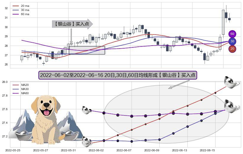 形态多维评估: ⚀ 2022-06-06-日至2022-06-16-日显现 20日-30日-60日均线 【银山谷】买入点 看多信号,后市看涨,买入