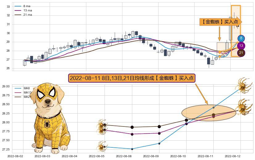 形态多维评估: ⚀ 2022-08-11日显现 8日-13日-21日均线 【金蜘蛛】买入点 看多信号,后市看涨,买入