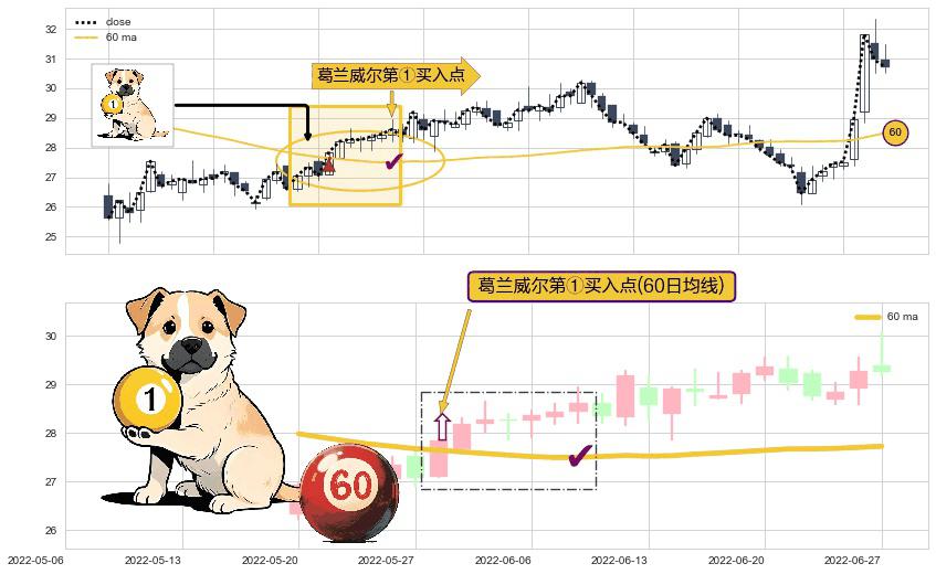 形态多维评估: ⚀ 2022-05-30-日显现 葛兰威尔均线 60日均线 第买①入点 走势反转见底信号,后市看涨,买进信号