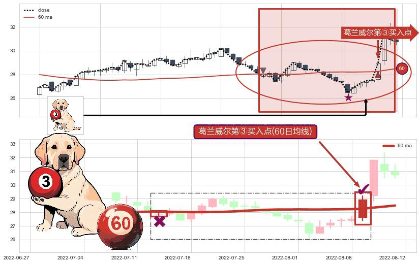 形态多维评估: ⚀ 2022-08-09-日显现 葛兰威尔均线 60日均线 第③买入点 上升趋势的中继信号,后市看涨,买进信号