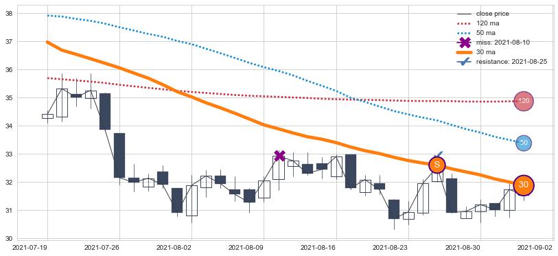 下跌趋势2021-07-19-2021-09-02,均线30确认关键阻力1处
