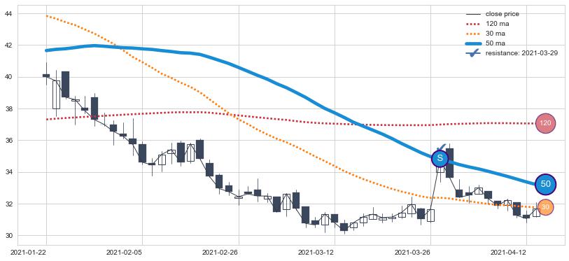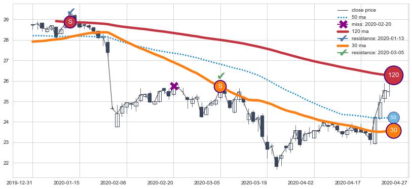 下跌趋势2019-12-31-2020-04-27,均线120, 30确认关键阻力2处