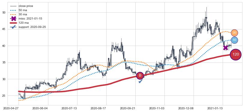 上涨趋势2020-04-27-2021-01-22,均线120确认关键支撑1处