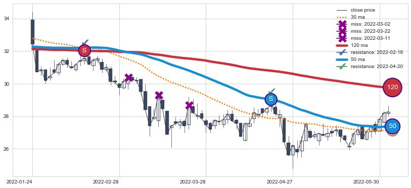 下跌趋势2022-01-24-2022-06-01,均线120, 50确认关键阻力2处