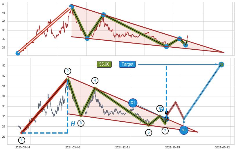 ➣ D点拟合预测价格34.31,距离最后交易收盘价格30.72相差 +11.69%