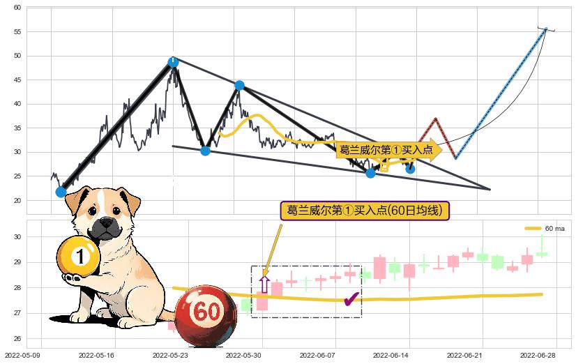 | 5 🅚:【鱼跃龙门】买入点 ➕ 📐:降楔型向上突破击穿阻力位, 猜想持续拉升上涨,被突破的阻力位已变为支撑位 ☞ 看多信号 ⇥ 【均线】交织【图形】⇥ 综合量化分数: 60 | > |
