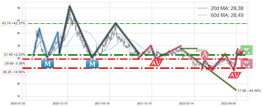 ➢ 【仅预测突破】最后价格:30.72与预测突破价格:28.23→【空间较大】后续最小【整理】第一目标价格→(2022-11-23: 21.07 )