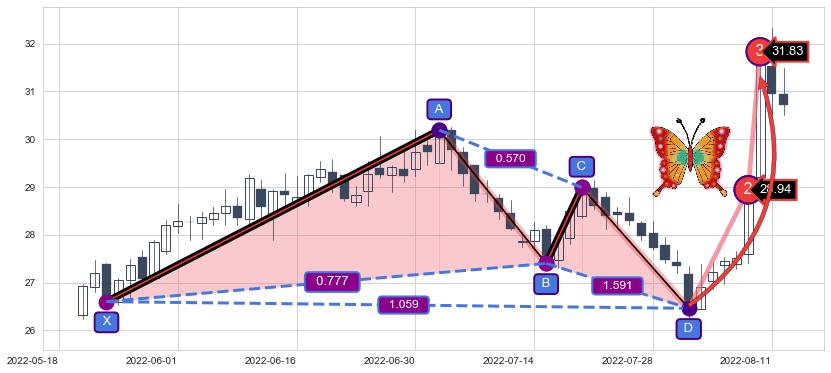 ➣ 已完成【蝴蝶】形态起点X: 2022-05-24, 终点D: 2022-08-02, 共50交易日