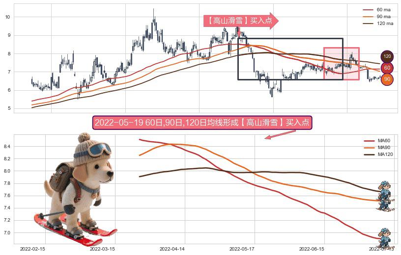 ⚀ 2022-03-24日-2022-07-07日显现 60日-90日-120日均线 【高山滑雪】买入点 看多信号,后市看涨,买入