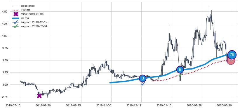 ⚁ MA5和MA10走势平行,且始终保持在短距离内,MA20始终在短中期均线下方,与短中期均线保持一定的距离,微微上行