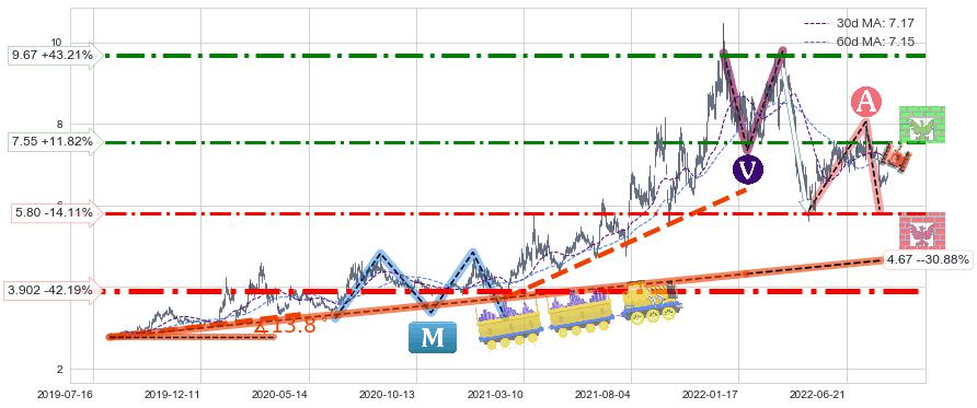 ♘ 阻力价格位7.55,可信任强度63.83%,距离最后交易2022-08-12形成的收盘价格6.75相差 +11.82%