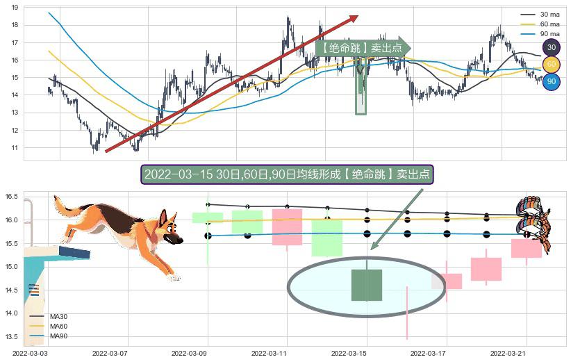 形态多维评估: ⚀ 2022-03-15日显现 30日-60日-90日均线 【绝命跳】卖出点 看空信号,后市看跌,卖出