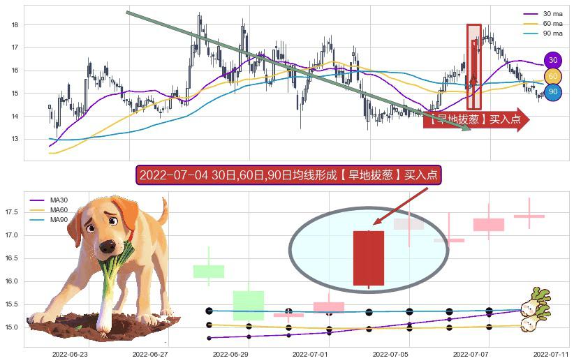 形态多维评估: ⚀ 2022-07-04日显现 30日-60日-90日均线 【旱地拔葱】买入点 看多信号,后市看涨,买入