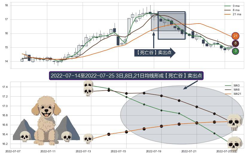 形态多维评估: ⚀ 2022-07-15-日至2022-07-25-日显现 3日-8日-21日均线 【死亡谷】卖出点 看空信号,后市看跌,卖出