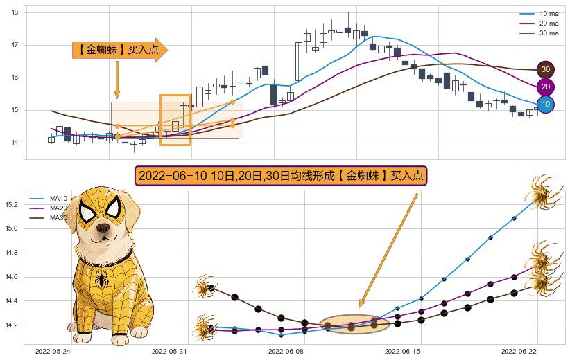 形态多维评估: ⚀ 2022-06-10日显现 10日-20日-30日均线 【金蜘蛛】买入点 看多信号,后市看涨,买入