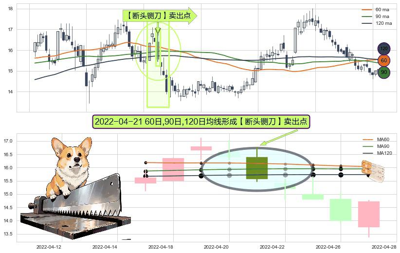 形态多维评估: ⚀ 2022-04-21日显现 60日-90日-120日均线 【断头铡刀】卖出点 看空信号,后市看跌,卖出