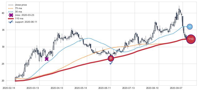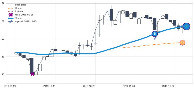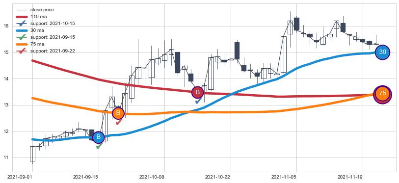上涨趋势2021-09-01-2021-11-23,均线75, 110, 30确认关键支撑3处