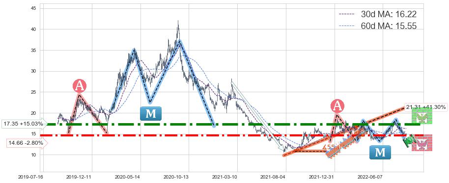♘ 阻力价格位17.35,可信任强度87.97%,距离最后交易2022-08-12形成的收盘价格15.08相差 +15.03%