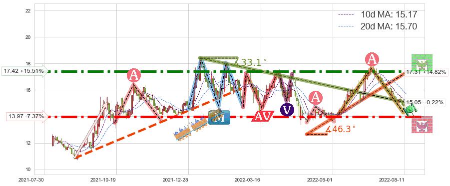 ♘ 阻力价格位17.42,可信任强度99.93%,距离最后交易2022-08-12形成的收盘价格15.08相差 +15.51%