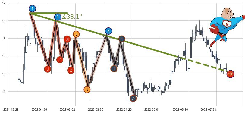 ⚔️ 2022-01-10-2022-06-15下跌趋势存在反转上涨[机会],虽然原下跌趋势的阻力位(15.05)已被突破,但其阻力效果尚存,原下跌趋势角度: 33.1˚