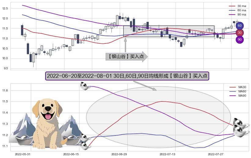 形态多维评估: ⚀ 2022-06-21-日至2022-08-01-日显现 30日-60日-90日均线 【银山谷】买入点 看多信号,后市看涨,买入