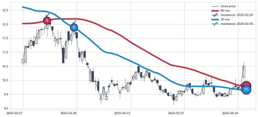 下跌趋势2020-02-07-2020-06-08,均线35, 60确认关键阻力2处