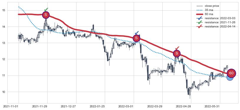 下跌趋势2021-11-01-2022-06-08,均线60确认关键阻力3处