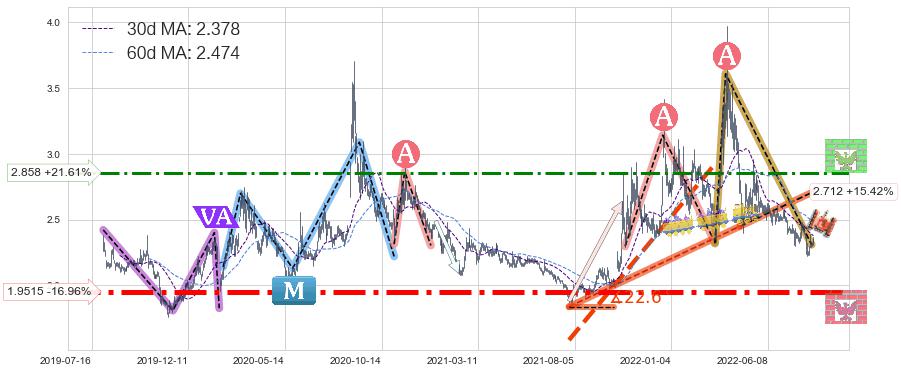 ♘ 阻力价格位2.858,可信任强度69.41%,距离最后交易2022-08-12形成的收盘价格2.350相差 +21.61%