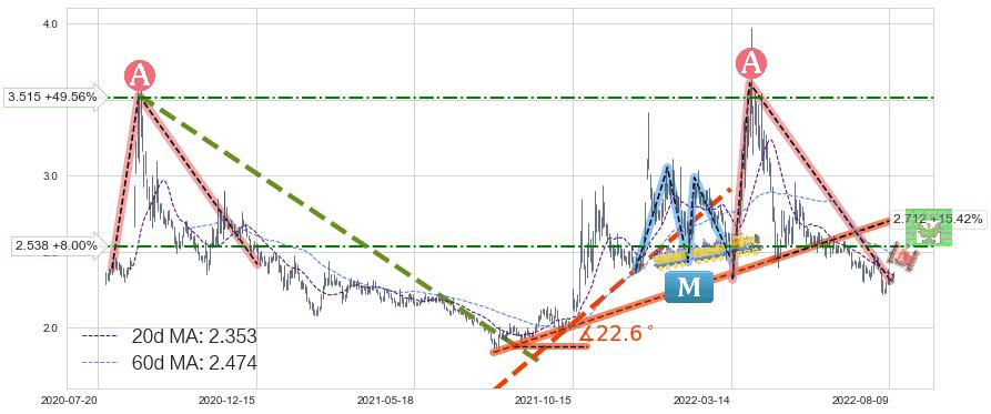 ♘ 阻力价格位2.538,可信任强度51.94%,距离最后交易2022-08-12形成的收盘价格2.350相差 +8.00%