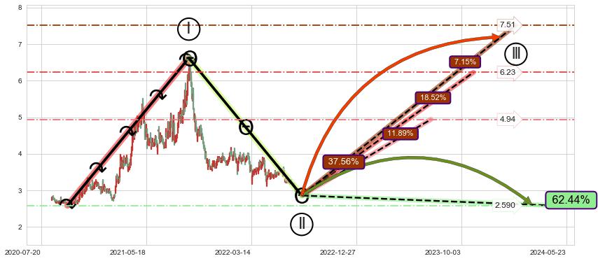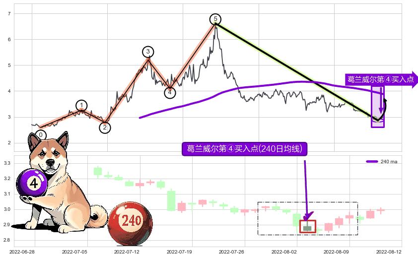 ➢ 循环浪继续向上【最低】位置(2023-07-13, 4.94),匹配聚类样本比例31.66%, 可能性概率11.89%