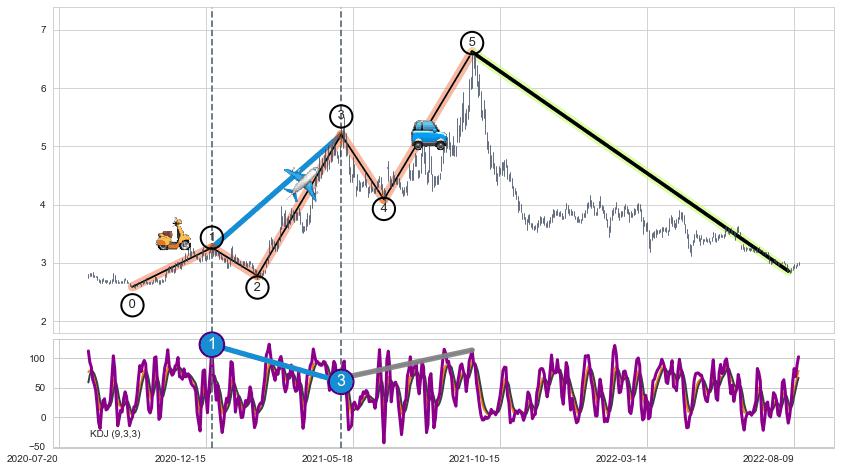 ➣ 第一, 三驱动浪端点:【KDJ】走势出现【常规背离 & 反转信号】背离程度81.37%,背离夹角角度119.9˚,背离程度较大
