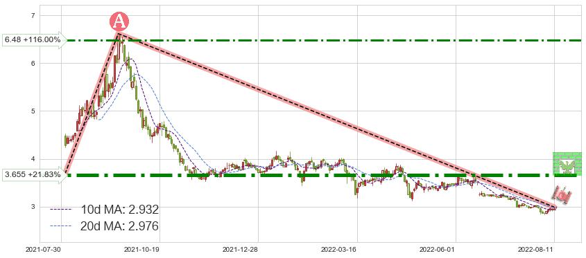 ♘ 阻力价格位3.655,可信任强度88.19%,距离最后交易2022-08-12形成的收盘价格3.000相差 +21.83%