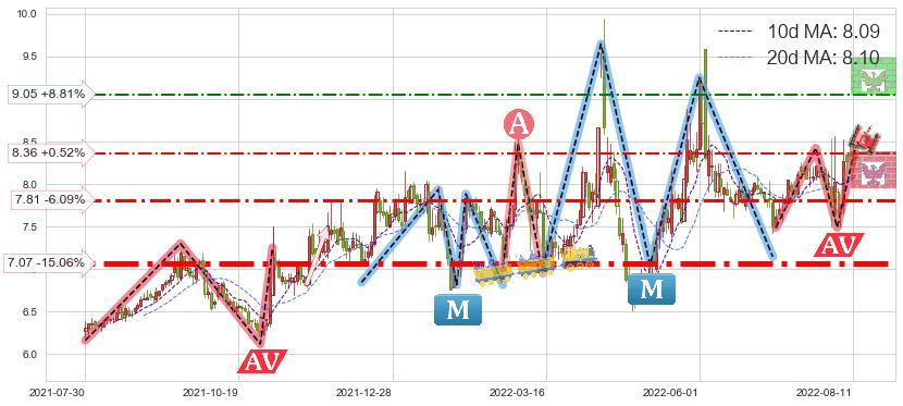 ♘ 阻力价格位9.05,可信任强度52.25%,距离最后交易2022-08-12形成的收盘价格8.32相差 +8.81%
