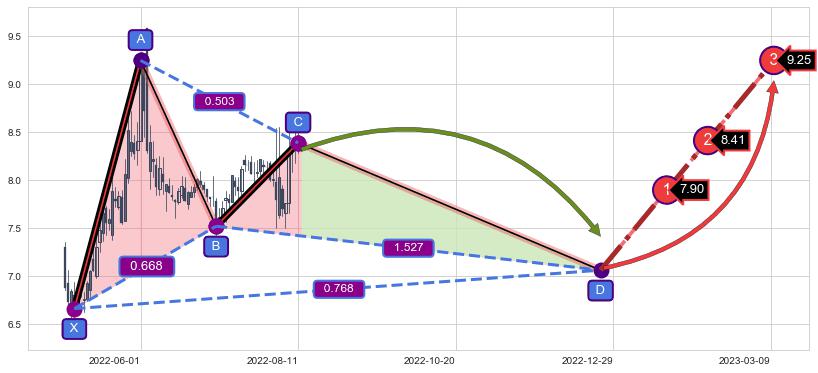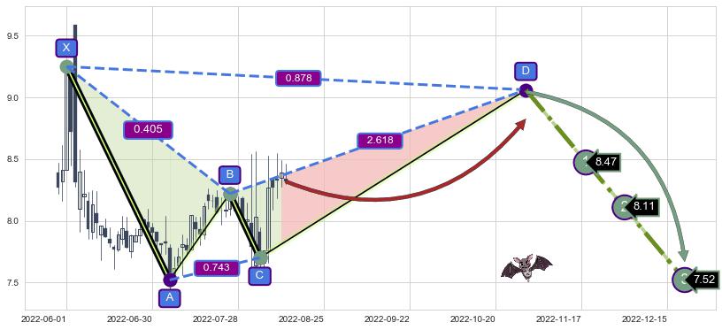 ➣ 未完成【蝙蝠】形态起点X: 2022-06-01, 已到达C点: 2022-08-04, 预测最终D点: 2022-10-31, 共107交易日