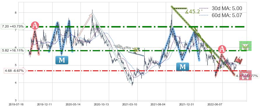 ♘ 阻力价格位5.82,可信任强度75.58%,距离最后交易2022-08-12形成的收盘价格5.01相差 +16.11%