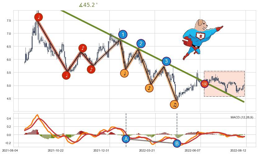 ⚔️ 2021-09-02-2022-05-31下跌趋势存在反转上涨[机会],其原下跌趋势的阻力位(4.37)已被突破[强支撑信号],原下跌趋势角度: 45.2˚