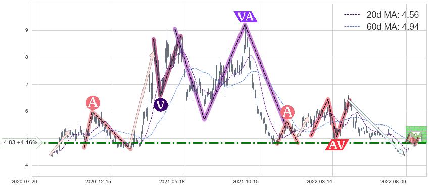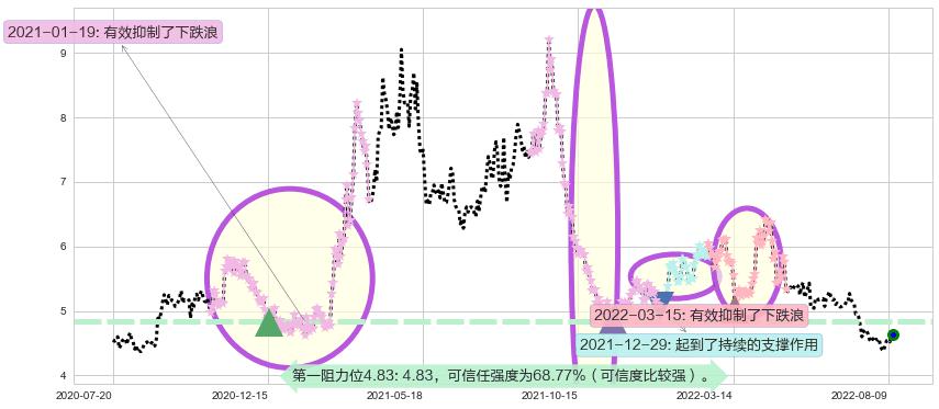 ♘ 阻力价格位4.83,可信任强度68.77%,距离最后交易2022-08-12形成的收盘价格4.64相差 +4.16%