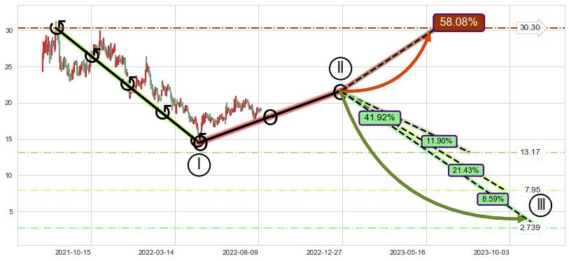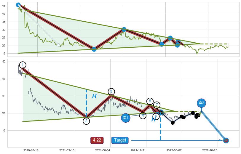 ➣ D点拟合预测价格38.97,距离最后交易收盘价格18.95相差 +105.64%