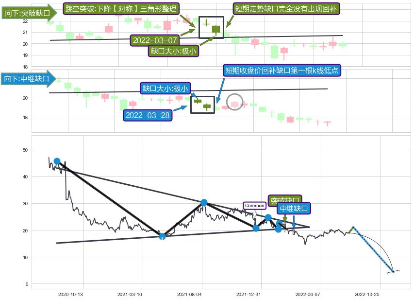 ➣ 普通缺口在【下降【对称】三角形整理】震荡整理形态中出现