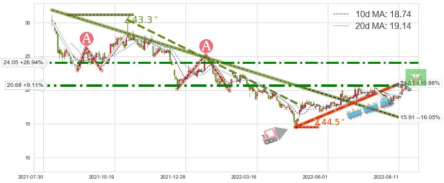 ♘ 阻力价格位24.05,可信任强度76.22%,距离最后交易2022-08-12形成的收盘价格18.95相差 +26.94%