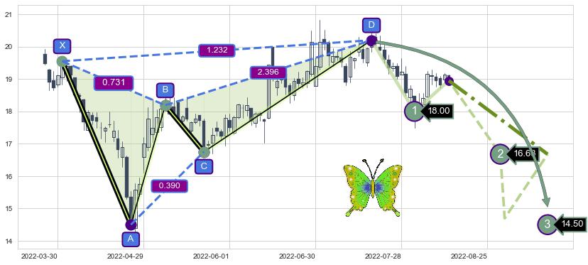 ➣ 已完成【蝴蝶】形态起点X: 2022-03-31, 终点D: 2022-07-19, 共73交易日