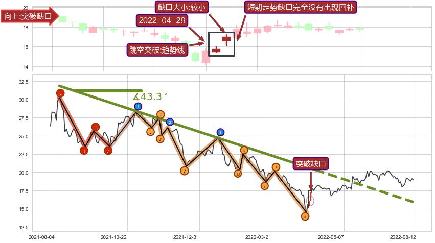 ➣ 2021-08-09-2022-05-09下跌趋势存在反转上涨[机会],其原下跌趋势的阻力位(15.91)已被突破[强支撑信号],原下跌趋势角度: 43.3˚
