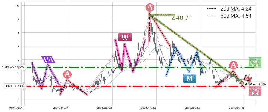 ♘ 阻力价格位5.42,可信任强度91.67%,距离最后交易2022-08-12形成的收盘价格4.24相差 +27.92%