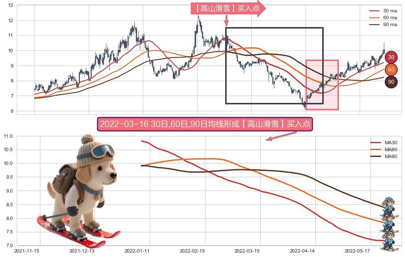 ⚀ 2022-01-06日-2022-05-24日显现 30日-60日-90日均线 【高山滑雪】买入点 看多信号,后市看涨,买入