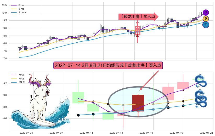 ⚀ 2022-07-14日显现 3日-8日-21日均线 【蛟龙出海】买入点 看多信号,后市看涨,买入