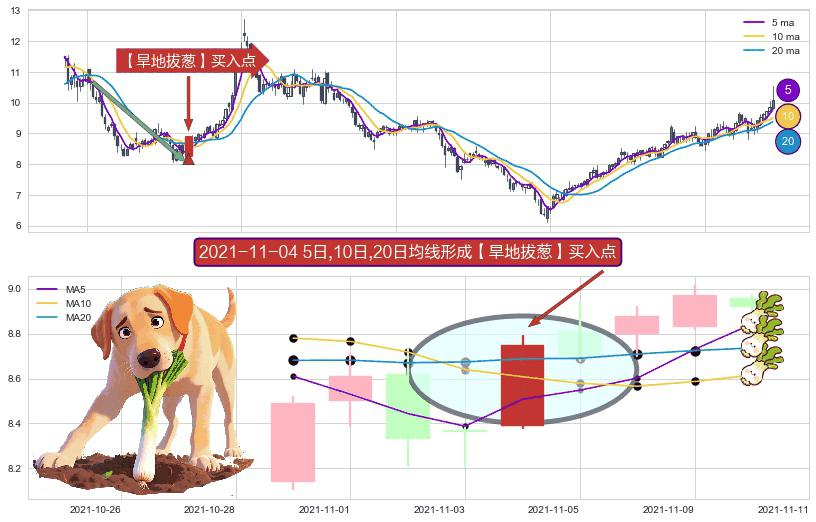 ⚀ 2021-11-04日显现 5日-10日-20日均线 【旱地拔葱】买入点 看多信号,后市看涨,买入